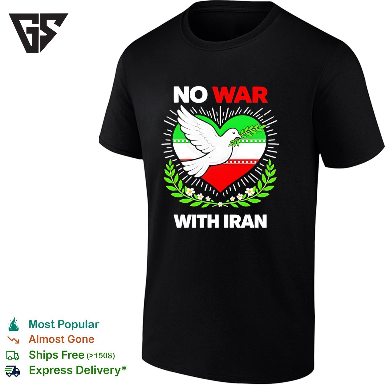 Be the first to review “No War With Iran Dove Heart Iran Flag T-Shirt”