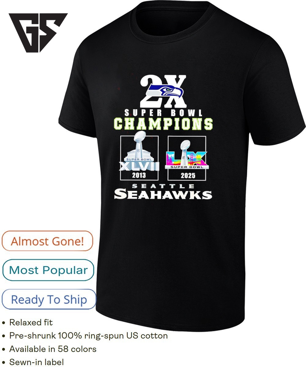 Join the movement with our Seahawks Seattle 2x Super Bowl Lx And Xlvii Champions 2025 T-Shirt – the sports tee that’s taking social media by storm! This trending design captures the energy and passion that’s got everyone talking. Whether you’re at the game, hitting the gym, or just showcasing your athletic style, this viral sensation is your ticket to staying ahead of the curve.