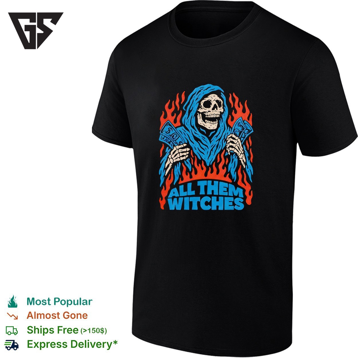 Be the first to review “Skeleton Holding Money All Them Witches Root Of All Evil T-Shirt”