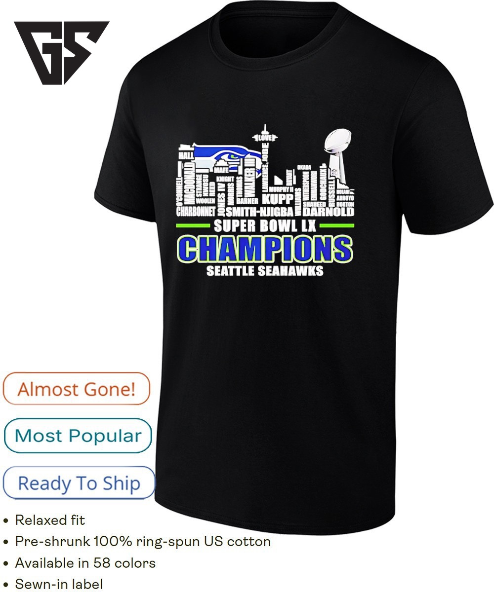 Super Bowl Lx Champions 2025 Seattle Seahawks Player Names City Skyline T-Shirt