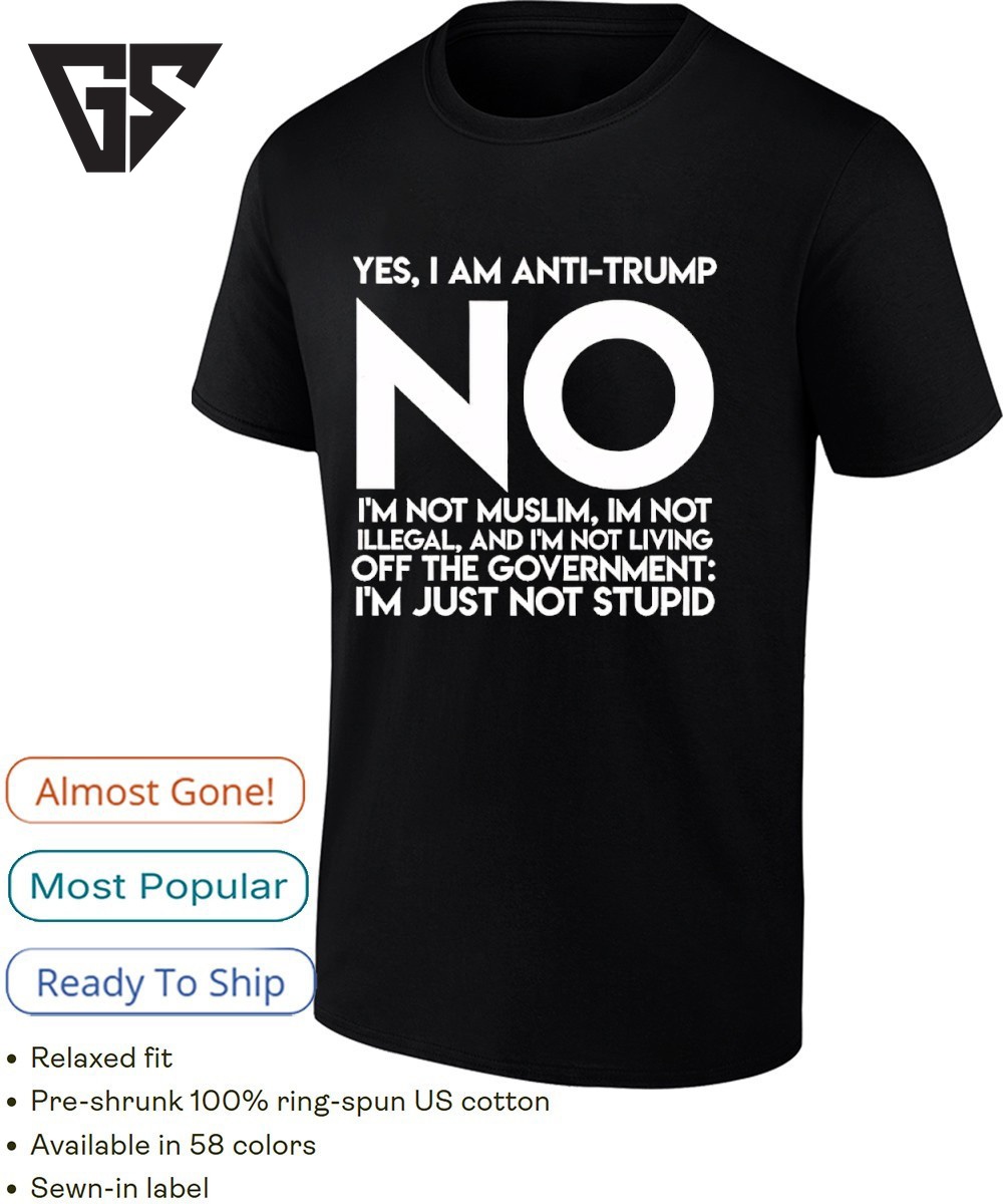 Be the first to review “Yes I’m Anti Trump No I’m Not Muslim I’m Not Illegal And I’m Not Living Off The Government I’m Just Not Stupid T-Shirt” Cancel reply